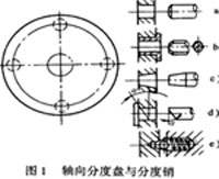 在圖2中,圖a是矩形槽盤;盤b、c是斜面槽盤;圖d是用齒形槽盤及其各種分度銷結(jié)構(gòu)。