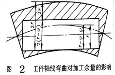 如果本工序有裝夾誤差,包括定位誤差、夾緊變形誤差、夾具本身誤差等,使工件在加工時(shí)位置發(fā)生偏移,本工序加工余量應(yīng)考慮這些誤差 影響。如圖3所示用三爪自動(dòng)定心卡盤夾持工件外圓加工孔時(shí),若工件軸心線偏移機(jī)床主軸回轉(zhuǎn)軸線一個(gè)e值,贊成內(nèi)孔切削余量不均勻,為使上工序的各項(xiàng)誤差和缺陷在本工序切除,應(yīng)將孔的加工余量加大2e。