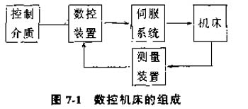 (1)數(shù)控機床的組成,數(shù)控機床一般由控制介質(zhì)、數(shù)控裝置、伺服系統(tǒng)和機床成本體組成。圖7-1的實線所示為開環(huán)控制的數(shù)控機床框圖。
