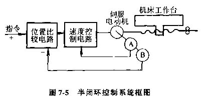3)半閉環(huán)控制數(shù)控機床,這種控制方式對工作臺的實際位置不進行檢查測量,而是通過與伺服電動機有聯(lián)系的測量元件,如測速發(fā)電機A和光電編碼盤B(或旋轉(zhuǎn)變壓器)等間接檢測出伺服電動機的轉(zhuǎn)角,推算出工作臺的實際位移梁,并與指令值進行比較,用差值來實現(xiàn)控制(圖7-5)。這種控制方式工作臺沒有完全包括在控制回路內(nèi),精度沒有閉環(huán)高,調(diào)試卻比閉環(huán)方便。