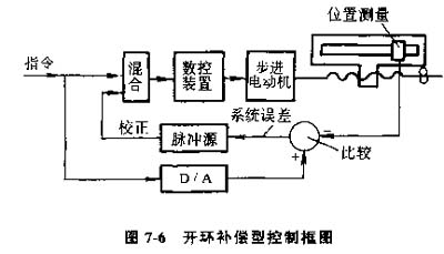 4)開換補償型數(shù)控機床,將上述三種控制方式的特點有選擇地集中起來,可以組成混合控制的方案。大型數(shù)控機床,需要高得多的進給速度和返回速度,又需要相當(dāng)高的精度。如果只采用全封閉的控制,機床傳動鏈和工作臺全部置于控制環(huán)節(jié)中,安裝調(diào)試十分復(fù)雜,為了避免這些矛盾,可以采用混合控制方式。圖7-6為開環(huán)補償方式的組成框圖。它的特點是:基本控制選用步進電動機的開環(huán)控制伺服機構(gòu),附加一個校正伺服電路。通過裝在工作臺上的直線位移測量元件的反饋信號來校正機械系統(tǒng)的誤差