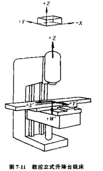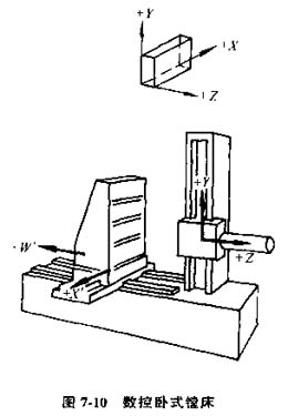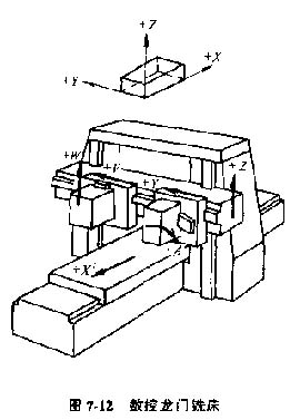 圖7-9~圖7-20是12種有代表性的數(shù)控機床的坐標(biāo)簡圖。在簡圖中,字母表示運動的坐標(biāo),箭頭表示正方向。沒有列出的機床,可按前述的原則命名。對于使用者,機床運動的坐標(biāo)可在機床使用說明書上找到。不少數(shù)控機床還用標(biāo)牌將運動的坐標(biāo)標(biāo)注在機床的顯著位置。