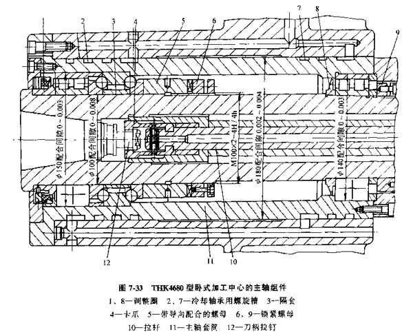 圖7-33所示為THK4680型臥式加工中心的主軸組件,其前軸承為圓錐孔雙列圓柱滾子軸承B3182120和雙向推力角接觸球軸承C2268120,后軸承為C3182118。這些軸承均經(jīng)預(yù)緊,B3182120靠修磨調(diào)整圈1.C2268120靠修磨隔套3來調(diào)整預(yù)緊量,由帶導(dǎo)向配合的螺母5.鎖緊螺母6.壓緊;后軸承靠修磨調(diào)整圈8調(diào)整預(yù)緊量,由鎖緊螺母9壓緊。主軸套筒11與主軸箱體孔由配作保證精密配合,這種高精度、高剛度的主軸組件,其錐孔軸線的徑向圓跳動在0.003mm以內(nèi)(主軸端部)。