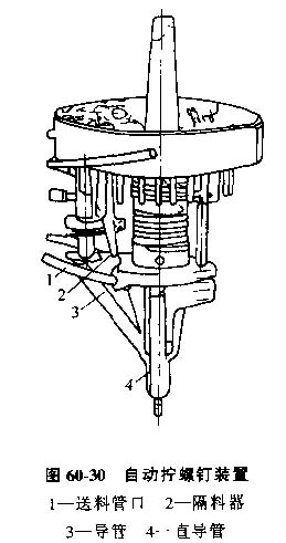 (1)導(dǎo)管式螺釘自動裝配工作頭,這種工作頭通過導(dǎo)管來引導(dǎo)已定向的螺釘按正確的姿態(tài)進(jìn)入裝配位置。圖60-30為一種擰緊器與供料裝置為一體的自動擰緊螺釘裝置。螺釘在送料管口1處被隔料器2擋住,主軸帶動改錐將螺釘擰入工件后,該錐上抬,隔料器2放下一個螺釘使之沿導(dǎo)管3進(jìn)入直導(dǎo)管4,進(jìn)入新的循環(huán)。