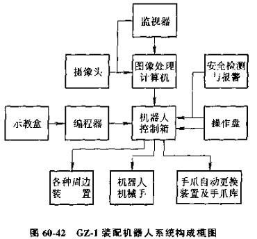 我國研制CZ-1型高速精度智能裝配機(jī)器人是一種可帶視覺的SCARA型機(jī)器人,具有由直流伺服電動機(jī)驅(qū)動的四個自由度。其基本結(jié)構(gòu)框見圖60-42。各部分的功能為: