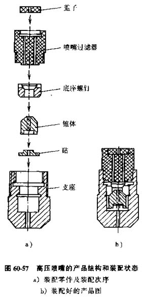 1)產(chǎn)品結(jié)構(gòu)與裝配狀態(tài),裝配圖樣可以提供產(chǎn)品的全貌。如圖60-57所示的高壓噴嘴,圖中各零件都可以逐件沿中心線裝配,因此整個(gè)裝配過(guò)程可以在一個(gè)隨行夾具上完成。不需要預(yù)裝配操作。