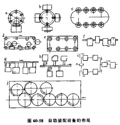 圖60-58所示為一些基本的自動裝配系統(tǒng)布置,圖中a、b為回轉(zhuǎn)型裝配機,一般用在形狀不復(fù)雜,尺寸不太大、工位數(shù)不多的場合;圖a系統(tǒng)是半自動裝配,只有一個自動裝配工位。圖c、d、c系統(tǒng)為產(chǎn)品沿運輸裝置運動,在若干個工序上實現(xiàn)裝配工序的線性裝配機,圖c所示系統(tǒng)具有水平封閉運輸裝置,可用于較復(fù)雜、裝配工位較多的產(chǎn)品裝配,當(dāng)有些裝配工序要求很長的作業(yè)時間時,宜采用平行一順次裝配,圖f、g、h、i為直線輪換流程式裝配線;圖j為轉(zhuǎn)字式裝配線,在大批量的產(chǎn)品裝配時優(yōu)先采用。