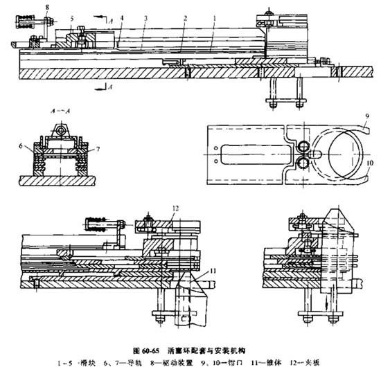 A. 在活塞槽中安裝活塞環(huán)的機(jī)構(gòu),圖60-65機(jī)構(gòu)做成盒子形狀,盒子的壁由滑塊1、2、3、4、5形成,每一個滑塊帶一套活塞環(huán)中、的一個。滑塊依次安排在導(dǎo)軌6和7上。導(dǎo)軌具有斜角,可將活塞環(huán)壓在安裝基準(zhǔn)中,在起始位置上,這個些滑塊的端部構(gòu)成了一個朝向工作區(qū)的臺階,除最底下的一個滑塊外,每一個滑塊都有一塊擋鐵,作為推桿來推動其下面的滑塊;上面的滑塊4與往復(fù)運(yùn)動驅(qū)動裝置8相連;瑝K的端部作成兩鉗口9和10,相互之間為彈性聯(lián)系。在導(dǎo)軌6和7上,滑塊按活塞環(huán)的給定高度配置。從專用的盒狀料倉中通過導(dǎo)軌的縫隙拉出活塞環(huán)。當(dāng)滑塊5運(yùn)動時,由于位于滑塊4槽上的擋鐵帶動滑塊4,類似地使滑塊3等移動。每一滑塊確定的間隙在自己的導(dǎo)軌上移動。接著又沿導(dǎo)軌的斜面移動,滑塊一個個地堆積起來。此時,每個活塞環(huán)以自己的大部分端面支撐在踝塊張開的爪上,并被上面滑塊壓住。