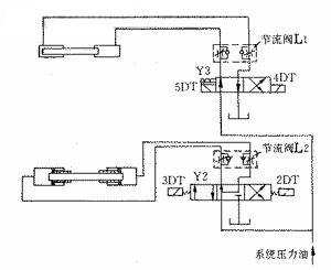 為解決問題,液壓系統(tǒng)從兩方面著手:換向閥Y1重新選型;在系統(tǒng)中增加速度調(diào)節(jié)環(huán)節(jié)。改造后的原理圖如圖2所示。選用國產(chǎn)24WE6D50/CFG24型電磁換向閥Y3替換Y1。閥Y3記憶功能,不因電磁鐵失電而改變閥芯位置。在Y3、Y2出油口處增加了節(jié)流閥組L1L2,使變速油缸1、2獲得理想的運動速度。