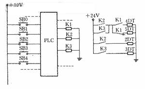 由于閥Y3帶有2個電磁鐵(4DT、5DT),且為關(guān)系,如何從已占滿的PLC輸出端點中引出一控制信號來控制5DT(3)?若增加一輸出端點來控制5DT,勢必要增加輸出模塊,并要修改梯形圖,從而大大增加了改造費用。為此我們對PLC輸出點進行了一些改動(4),圓滿地解決了PLC輸出點不足的問題。把PLC原來直接推動電磁鐵改為推動中間繼電器K1、K2、K3,然后由K1、K2、K3來控制電磁鐵4DT、5DT、2DT、3DT。通過K1的常開和常閉點,使4DT5DT滿足了的關(guān)系。