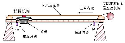 玻屏移載機(jī)的結(jié)構(gòu)如圖3所示,采用2.2kW電機(jī)驅(qū)動(dòng),電機(jī)額定電壓380V,額定工作頻率50HZ,額定電流5.0A,額定轉(zhuǎn)速1420r/m,減速比1:17,安裝有2個(gè)接近開關(guān),其中1#和2#接近開關(guān)之間距離大約1400~1800毫米,移載平臺(tái)帶負(fù)荷約150~170kg左右。移載機(jī)要求在兩個(gè)限位開關(guān)之間運(yùn)動(dòng)和定位,定位精度誤差要求3毫米以內(nèi),單行程移動(dòng)完成時(shí)間大約2-3秒,即從1#限位開關(guān)加速到恒速,再到減速停止在2#限位點(diǎn)的時(shí)間要求在2-3秒內(nèi)完成。