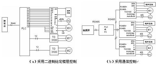 對(duì)于立體倉庫、立體車庫這樣需要X、Y、Z三維多點(diǎn)定位運(yùn)動(dòng)控制的場(chǎng)合,采用TD3100實(shí)現(xiàn),可以大大簡化電路,降低成本,提高可靠性。由于最高層數(shù)可以達(dá)到128層,因此采用給定目的樓層的距離控制,使用異常簡單。采用TD3100立體倉庫的系統(tǒng)如圖4所示,圖中UPL與DWL信號(hào)可以使用用戶的平層開關(guān)信號(hào),也可以直接將UPL與DWL與COM短接。FLE為目的層使能端子,當(dāng)其有效時(shí),F1~F7的給定層信號(hào)有效;INI為當(dāng)前層初始化端子,其有效時(shí),恢復(fù)當(dāng)前層為F1~F7的給定層。從圖中對(duì)比可以看出,采用通信控制,線路簡單,節(jié)省資源,節(jié)省成本。需要注意一點(diǎn)的是,目前該功能需要非標(biāo)定制。當(dāng)然該系統(tǒng)在應(yīng)用前還需要進(jìn)行層高自學(xué)習(xí),自學(xué)習(xí)方法同上節(jié)描述,只需要將總層數(shù)F7.00按照實(shí)際情況設(shè)定即可。
