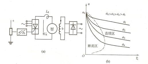 圖3(b)中的每一條機械特性曲線都由兩段組成,在電流連續(xù)區(qū)特性還比較硬,改變延遲角a時,特性呈一簇平行的直線,它和發(fā)電機-電動機組供電時的完全一樣。但在電流斷續(xù)區(qū),則為非線性的軟特性。這是由于晶閘管整流器在具有反電勢負載時電流易產生斷續(xù)造成的。