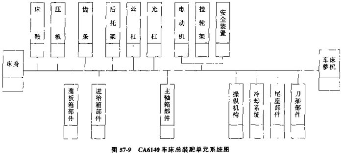 裝配單元系統(tǒng)圖(圖57-9)直觀地表示出產(chǎn)品的劃分及其裝配順序。習(xí)慣上先繪出一條永橫線,在橫線的左端繪出代表基準件的長方格,右端繪出代表產(chǎn)品的長方格。圖中每一零、部件都用長方格表示,方格中可以注明裝配單元的名稱、數(shù)量和編號。將零件繪在橫線上面,部件繪在橫線下面。