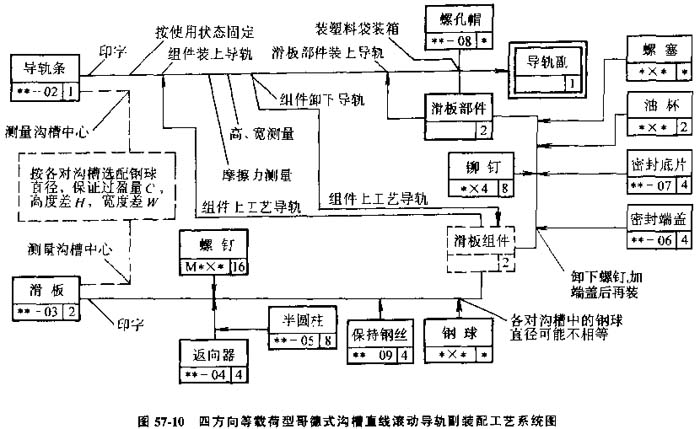 在裝配單元系統(tǒng)圖上,加注必要的工藝說明,如焊接、配鉆、攻螺紋、檢測及在裝品的移位、翻轉(zhuǎn)等,則夠成裝配工藝系統(tǒng)圖,見圖57-10。