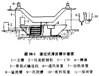 為了提高清洗作業(yè)的勞動(dòng)生產(chǎn)率?梢圆捎美鐖D58-1所示的帶有傳送機(jī),根據(jù)工件的質(zhì)量大小選擇適當(dāng)?shù)膫魉脱b置,如地面式傳送小車或履帶式傳送機(jī)等等。對(duì)于大型工件,一般采用進(jìn)、出清洗槽。
