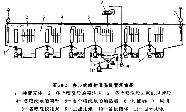 (2)噴射清洗裝置,噴射清洗裝置通過(guò)泵將清洗液噴射到工件表面。圖58-2為一種多室式多步清洗裝置示意圖,該裝置包括:裝置殼體、槽體、噴射系統(tǒng)、清洗液加熱裝置和通風(fēng)裝置等,其核心系統(tǒng)為噴射系統(tǒng)。