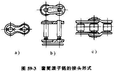 套筒滾字鏈的接頭形式見圖59-3所示。圖59a為用開口銷固定活動(dòng)銷軸,圖59-3b為用彈簧卡片固定活動(dòng)銷軸,這兩種方法都用于鏈條節(jié)數(shù)為偶數(shù)。用彈簧卡片時(shí)要注意使開口端方向與鏈條的速度方向像反,以防在運(yùn)轉(zhuǎn)中脫落。圖59-3c為采用過渡鏈節(jié)結(jié)合,用于鏈條節(jié)數(shù)為奇數(shù)。