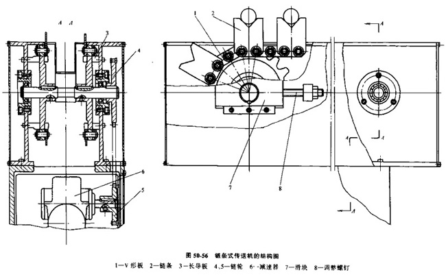 如圖50-56所式,它由兩列封閉式鏈條、鏈輪和驅(qū)動裝置所組成。用于支承工件及定位的V形板1,等距地固定在鏈條2的削軸上,隨同鏈條一起運(yùn)動。鏈條由電動機(jī)通過減速器6和鏈輪5、4傳動,為了防止鏈條下垂,每個環(huán)節(jié)側(cè)面的滾子支承在導(dǎo)板3上,在減速器軸端裝有電磁離合器。用來實現(xiàn)鏈條的準(zhǔn)確停止。鏈條的松緊可以通過螺釘8和滑塊7調(diào)節(jié)。