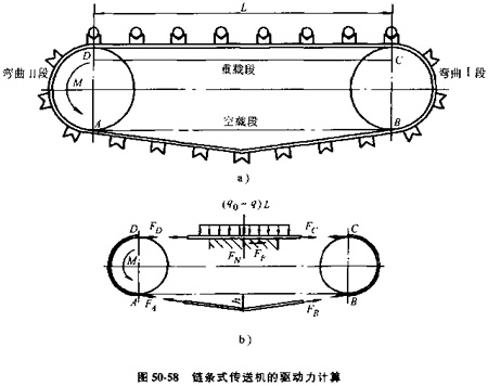 鏈條式傳誦機(jī)的驅(qū)動力F和驅(qū)動力距M,可參照鏈條運(yùn)輸機(jī)的受力分析方法計算,見圖50-58。