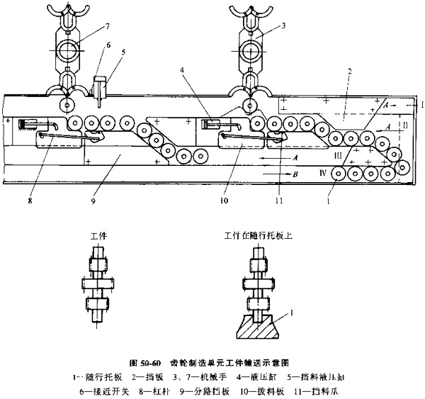 圖50-60是由鏈板履帶傳送機(jī)組成的齒輪加工單元,工件安裝在隨行托板中,在鏈板履帶上輸送,箭頭A表示工件傳送方向,工件從通道Ⅰ輸入,經(jīng)分路擋板2分成兩路。一路沿通道Ⅱ進(jìn)入第一臺滾齒機(jī)貯料區(qū),另一路沿通道Ⅲ經(jīng)分路擋板9進(jìn)入第二臺滾齒機(jī)貯料區(qū)。上料時,液壓缸4動作,通過杠桿機(jī)構(gòu)8使撥料板10及擋料爪11動作,撥料塊將工件撥至機(jī)械手3前,擋料爪則將通道Ⅱ繼續(xù)送來的工件擋住,加工好的工件由通道Ⅰ輸出。