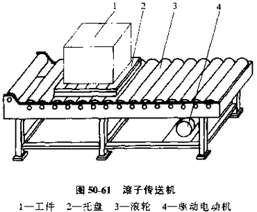 滾子傳送機(jī)是由一根根平行的轉(zhuǎn)軸。及轉(zhuǎn)軸上套的滾輪,鏈輪(或齒輪)及驅(qū)動裝置組成的。見圖50-61/滾輪安裝成等高,靠滾動摩擦力傳送工件。