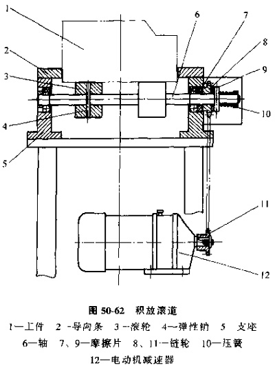 當(dāng)轉(zhuǎn)軸與鏈輪、滾輪均采用剛性聯(lián)接時,傳送機(jī)屬于強(qiáng)制滾輪,即不論工件處于什么狀態(tài),在電動機(jī)運(yùn)轉(zhuǎn)情況下,滾輪始終勻速轉(zhuǎn)動,此時如果工件被擋料器阻擋停下,滾輪與工件輸送面之間的滾動摩擦變?yōu)榛瑒幽Σ,會加大輸送面的磨損,這時對一些材質(zhì)較軟。用已精加工面作輸送面,或?qū)斔兔婢纫蟾叩墓ぜ螂S行夾具來說是不利的,因此,現(xiàn)在多采用積放式滾子傳送機(jī),也就是滾輪與轉(zhuǎn)軸之間,或轉(zhuǎn)軸與鏈輪之間,不采用剛性聯(lián)接,而是靠摩擦傳動,見圖50-62。當(dāng)正常輸送時,驅(qū)動力通過鏈條、鏈輪、滾輪、驅(qū)動工件,工件與滾輪間為純滾動,當(dāng)工件被擋住時,滾輪與轉(zhuǎn)軸或轉(zhuǎn)軸與鏈輪之間的摩擦力小于工件與滾輪間的靜摩擦,工件與滾輪保持靜止,而滾輪與轉(zhuǎn)軸,或轉(zhuǎn)軸與鏈輪之間相對打滑,從而減少了對工件輸送面的磨損。采用滾輪與轉(zhuǎn)軸相對摩擦傳動的方式,結(jié)構(gòu)相對簡單。但滾輪與轉(zhuǎn)軸間磨損較快,對輸送精度和維修更換不利。采用鏈輪端面摩擦方式,可以通過彈簧調(diào)整摩擦力。較少摩擦片磨損的影響。維修更換都比較方便,但軸向尺寸需要加大。