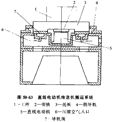 圖50-63是用于組成柔性制造系統(tǒng)的直線電動機(jī)傳送機(jī),在這一輸送系統(tǒng)中,托盤在空氣靜壓導(dǎo)軌上運(yùn)行,直線電動機(jī)設(shè)置在中部,銜鐵設(shè)置在托板下方。