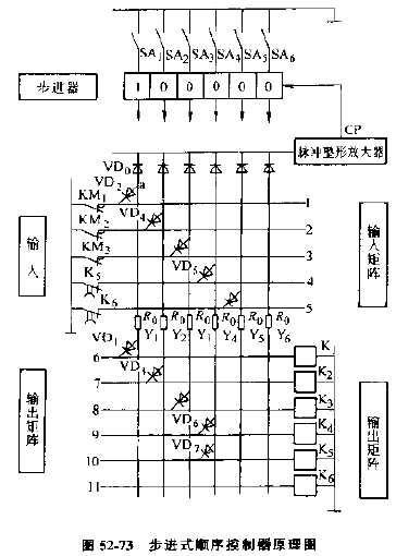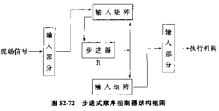 圖52-72是步進(jìn)式順序控制器的結(jié)構(gòu)框圖,F(xiàn)場(chǎng)信號(hào)通過(guò)輸入部分加到輸入矩陣,經(jīng)過(guò)輸入矩陣的邏輯運(yùn)算控制步進(jìn)器步進(jìn),步進(jìn)器R在輸出矩陣邏輯配合下送出信號(hào),完成控制過(guò)程。