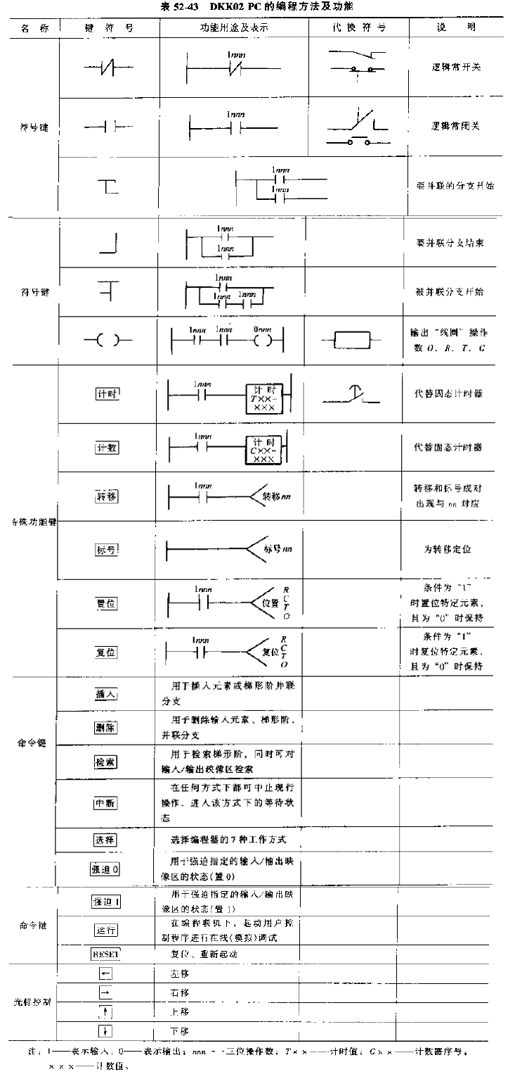 計(jì)時(shí)器32個(gè),計(jì)時(shí)范圍(0.1~9.9s),中間記憶256個(gè),順序控制的工程步進(jìn)器10個(gè),每個(gè)32步,外形尺寸485mm×220mm×150mm。該控制器特別適合于老設(shè)備的技術(shù)改造,用DKK02PC代替常規(guī)的繼電器邏輯控制可直接按原來(lái)的控制線路進(jìn)行編程,只是符號(hào)做一些變換,DKK02PC的編程方法及功能見(jiàn)表52-43。