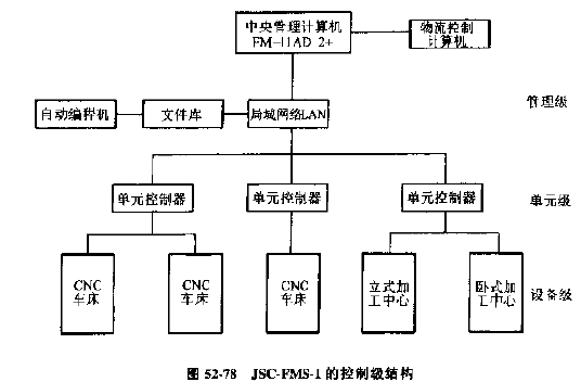 通常,柔性制造系統(tǒng)采取分層(級(jí))、分布式集中管理的控制結(jié)構(gòu),圖52-76表示了以多級(jí)計(jì)算機(jī)體系與結(jié)構(gòu)數(shù)據(jù)庫(kù)共享支撐下的分級(jí)管理塔。每一級(jí)計(jì)算機(jī)輔助一個(gè)相應(yīng)的管理層,計(jì)算機(jī)分為兩層或幾層,圖52-76為3級(jí)(層)計(jì)算機(jī)結(jié)構(gòu),圖52-77為4級(jí)計(jì)算機(jī)結(jié)構(gòu),一般公司級(jí)控制多用4級(jí)控制網(wǎng)絡(luò),工廠級(jí)控制多用3級(jí)分層控制網(wǎng)絡(luò)。對(duì)于柔性制造系統(tǒng),比較先進(jìn)的采用3級(jí)控制網(wǎng)絡(luò)。有時(shí)把計(jì)算機(jī)分層的級(jí)稱為控制級(jí)。