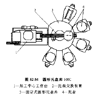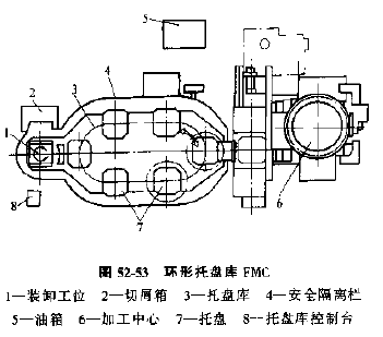 2) 圓環(huán)托板庫(kù)FMC,如圖52-54所示,其特點(diǎn)是托板庫(kù)是圓周分布,托板在裝卸工位,機(jī)床和托板庫(kù)各個(gè)位置之間輸送,通過(guò)庫(kù)中央的專(zhuān)門(mén)搬運(yùn)裝置實(shí)現(xiàn)托板的輸送。