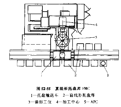 3) 直線形托板庫(kù)FMC,如圖52-55所示。相當(dāng)于上述的圓形托板庫(kù)展成直線形,托板輸送裝置常為有軌小車(chē),這種單元的優(yōu)點(diǎn)是具有擴(kuò)展性,需要時(shí)可增加加工設(shè)備,加長(zhǎng)運(yùn)輸軌道和托板庫(kù),擴(kuò)展成更大的FMC或其他柔性制造系統(tǒng)。