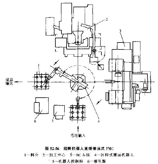 1) 回轉(zhuǎn)機(jī)器人直接搬運(yùn)的FMC(見(jiàn)圖52-56)由1~4臺(tái)車(chē)削中心或其他數(shù)控機(jī)床,以及固定安裝的回轉(zhuǎn)式機(jī)器人和工件存貯臺(tái)等組成,各設(shè)備都布置在機(jī)器人周?chē)騼蓚?cè),工件在加工過(guò)程中的搬運(yùn)都由機(jī)器人自動(dòng)實(shí)現(xiàn)。