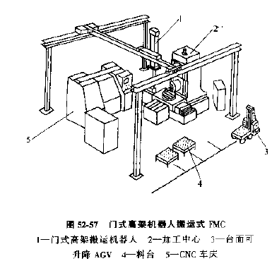 2) 龍門(mén)式機(jī)器人直接搬運(yùn)的FMC(見(jiàn)圖52-57)其特點(diǎn)是,可搬運(yùn)較大較重的零件和其他物料,搬運(yùn)設(shè)備不占場(chǎng)地。