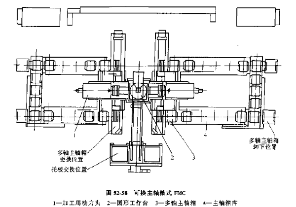 (3) 可換主軸箱式FMC,這種單元以多軸加工為主,適于品種不多的中、大批量的生產(chǎn),加工設(shè)備是可更換主軸箱的組合機(jī)床,單元內(nèi)設(shè)有主軸庫(kù)及其運(yùn)輸交換裝置,圖52-58所示為可換箱式FMC。工件通過(guò)托板交換裝置,從、外部系統(tǒng)進(jìn)入單元,送上圓形回轉(zhuǎn)工作臺(tái)夾緊,然后由兩側(cè)裝有相應(yīng)主軸箱的動(dòng)力頭驅(qū)動(dòng)加工。