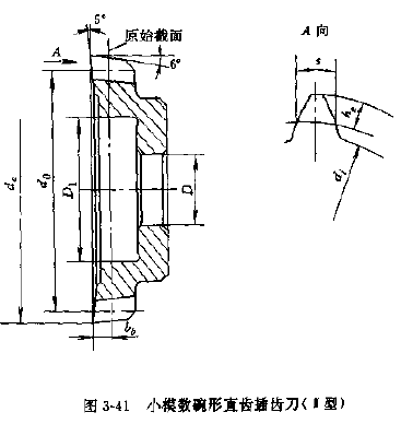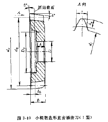 小模數(shù)直齒插齒刀,小模數(shù)直齒插齒刀已經(jīng)標(biāo)準(zhǔn)化,JB3095—82《小模數(shù)直齒插齒刀》中規(guī)定了盤形,碗形和錐柄三種型式的插齒機(jī)。盤形直齒插齒刀(Ⅰ型),其標(biāo)稱分度圓直徑為40,63mm兩種,精度等級(jí)分AA、A、B三種,其型式和尺寸見(jiàn)圖3-40和表3-93~表3-94。表3-97~表3-98。
