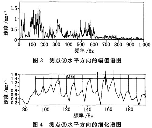 更換新齒輪后,再次進(jìn)行測(cè)量,測(cè)點(diǎn)③的水平方向的速度幅值從3.9 mm/s降到2.9 mm/s,加速度幅值從107. 3 m/s降到6.2 m/s,峭度指標(biāo)從原來(lái)的20. 2降到3. 17。說(shuō)明該機(jī)已正常運(yùn)行。