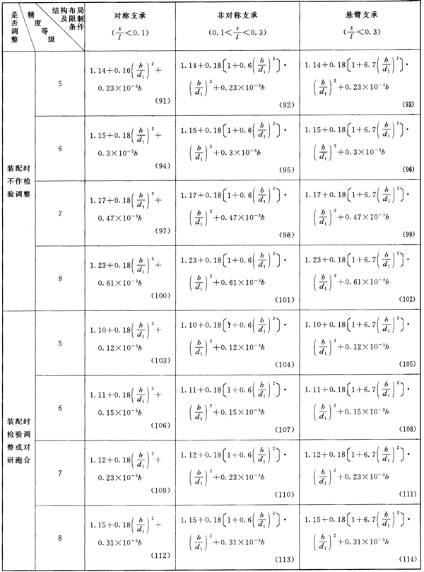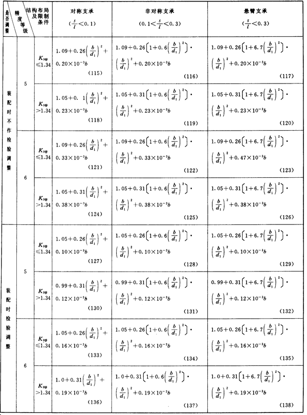 齒輪第Ⅲ公差組精度為5~8級(硬齒面為5~6級)及相應的結構布局限制條件的KHβ簡化計算公式見表14或表15。