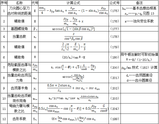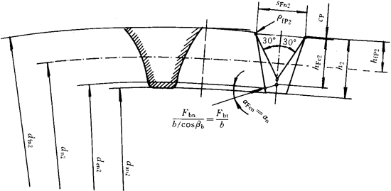 ρF——30°切線切點處曲率半徑。外齒輪由式(182)計算,內(nèi)齒輪由式(195)計算。