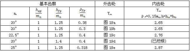 與圖18a18e各齒形參數(shù)相對應(yīng)的內(nèi)齒輪齒形系數(shù)YFa也可由表23查取。
