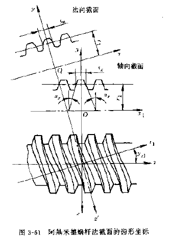 阿基米德蝸桿的法向截形方程,可按圖3-61所示的坐標關系,由阿基米德螺旋面的基本方程轉換求得。