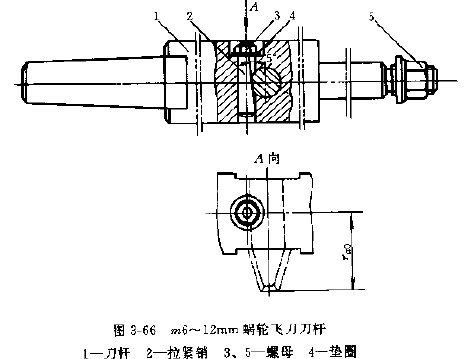 1.刀頭,飛刀刀頭一般作成圓柄狀,其前刃面通過柄部圓柱的軸線,根據(jù)被加工蝸輪模數(shù)的大小,刀頭一般分為三種,模數(shù)2~6、6~12、12~30的份刀圖3-62~圖3-64。后兩種飛刀頭由拉緊銷的斜面拉緊在飛刀刀桿上,飛刀刀柄平面與飛刀前面的夾角為 ,其值為: