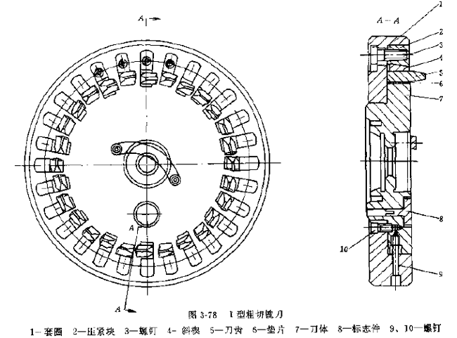 Ⅱ型雙面及三面粗切銑刀也是用于粗加工弧齒錐齒輪和準(zhǔn)雙面齒輪副中的大、小齒輪。該銑刀結(jié)構(gòu)先進(jìn),刀體強(qiáng)度高,剛性好,刀齒采用斜楔夾緊,刀齒分布緊湊,刀齒數(shù)量多,而且刀齒安裝靈活方便,這種銑刀只能用于進(jìn)口的格里森機(jī)床或新型仿制機(jī)床上。銑刀公稱(chēng)直徑有5、6、6.25、7.5、9等五種,其結(jié)構(gòu)型式和基本尺寸見(jiàn)圖3-78和表3-154~表3-155。