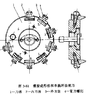 螺旋成形法和單循環(huán)法雙面精切銑刀實(shí)質(zhì)上是一種圓拉刀盤,它有軸向和徑向齒升量,這種刀盤有8個(gè)刀齒,4個(gè)外切刀齒,4個(gè)內(nèi)切刀齒,并有相當(dāng)于2個(gè)刀齒的空位,以便在齒過(guò)程中進(jìn)行分齒,螺旋成形法和單循環(huán)法有所不同,這兩種切齒方法都沒(méi)有滾切運(yùn)動(dòng),都是成形法,適用于弧齒錐齒輪和準(zhǔn)雙曲面齒輪副中大齒輪的精加工,這時(shí),與取配對(duì)的小齒輪都是用滾切法加工的,這兩種銑刀只能用在進(jìn)口格里森機(jī)床上,其公稱直徑有5,6,7.5,9,12in等,結(jié)構(gòu)型式和基本尺寸見(jiàn)圖3-81和表3-167~表3-168。