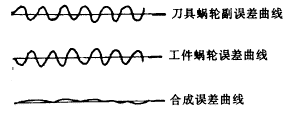 1. 累積誤差抵消。如果測(cè)出插齒機(jī)兩套蝸輪副的累積誤差是影響工件質(zhì)量的首要因素,可選用zc和z相等即z/zc=1,傳動(dòng)比等于1,使兩套蝸輪副的周期變得相同。再不斷對(duì)其中一套蝸輪進(jìn)行轉(zhuǎn)位,邊轉(zhuǎn)位邊測(cè)試曲線,直到其誤差曲線的相位變得和另一套蝸輪相反(相差180o)后固定。這樣,兩套蝸輪的累積誤差在以后的工作過(guò)程中將大部分抵消(圖3)。