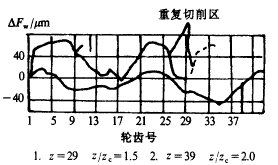從圖2中可以看出,工件與插齒刀齒數(shù)比例關(guān)系z(mì)/zc對(duì)Fw值的影響。圖中表示出齒輪的測(cè)量結(jié)果,z=29的齒輪,在重復(fù)切削區(qū)里,公法線長(zhǎng)度急劇變化,而z=39的齒輪未發(fā)現(xiàn)此情況,插齒刀齒數(shù)zc=20。