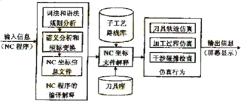 本文設(shè)計(jì)的數(shù)控車(chē)削仿真系統(tǒng)既可以對(duì)手工編制的單機(jī)數(shù)控車(chē)削程序進(jìn)行仿真,也可以作為CAD/CAPP/CAM集成制造系統(tǒng)中的一個(gè)子系統(tǒng),對(duì)集成制造系統(tǒng)自動(dòng)產(chǎn)生的數(shù)控車(chē)削程序進(jìn)行仿真。該系統(tǒng)可以完成對(duì)子程序的處理,允許運(yùn)動(dòng)坐標(biāo)的續(xù)效代碼和注釋行的存在,并且支持多種數(shù)控代碼格式,是一個(gè)通用的數(shù)控車(chē)削NC 程序仿真系統(tǒng),其工作流程如圖1所示。