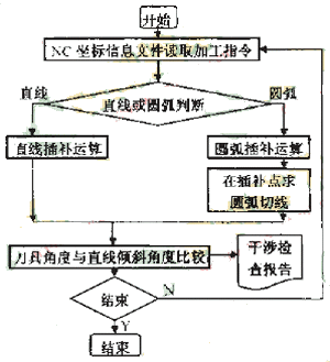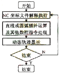 刀具軌跡動(dòng)態(tài)仿真是根據(jù)要進(jìn)行仿真的數(shù)控代碼,在計(jì)算機(jī)屏幕上動(dòng)態(tài)顯示刀具軌跡,以運(yùn)動(dòng)軌跡的方式來(lái)直觀顯示零件具體的加工過(guò)程;進(jìn)行刀具軌跡動(dòng)態(tài)仿真時(shí),順序讀入NC坐標(biāo)信息文件,獲取數(shù)控指令(直線、圓弧指令等)和命令參數(shù)(起點(diǎn)、終點(diǎn)和圓心坐標(biāo)等),然后執(zhí)行相應(yīng)的軌跡處理:對(duì)于直線和圓弧命令,則要根據(jù)其起止運(yùn)動(dòng)坐標(biāo),進(jìn)行直線和圓弧的插補(bǔ)運(yùn)算,得到運(yùn)動(dòng)過(guò)程中離散的中間點(diǎn)的坐標(biāo)值,然后動(dòng)態(tài)顯示刀具運(yùn)動(dòng)軌跡。刀具運(yùn)動(dòng)軌跡仿真算法流程如圖2所示。