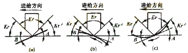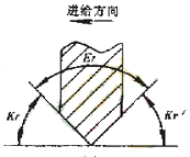 具體的干涉碰撞檢查算法,是在插值點(diǎn)將加工刀具的主偏角和副偏角與直線傾斜角度比較,對(duì)于圓弧段輪廓,則與該插值點(diǎn)在圓弧輪廓的切線的傾斜角進(jìn)行比較,并區(qū)分順圓和逆圓兩種情況。以右車(chē)刀切外輪廓為例,其對(duì)于直線和圓弧的干涉檢查如圖4所示。檢查結(jié)果將寫(xiě)入一個(gè)干涉報(bào)告中,圖4中,kr為主偏角.kr'為副偏角,Er為刀尖角,A為與切削加工方向相反的傾斜角,B為與切削加工方向相同的傾斜角。當(dāng)A>kr時(shí),刀具副切削刃和零件表面發(fā)生干涉,當(dāng)180°+B<180°-kr時(shí),刀具的主切削刃和零件表面發(fā)生干涉,這時(shí)將發(fā)生過(guò)切現(xiàn)象二對(duì)于不同的加工方向和加工輪廓,上述判別式應(yīng)進(jìn)行相應(yīng)的調(diào)整。